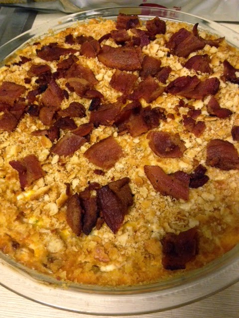 Mix all ingredients except bacon and crackers. Add ½ the bacon. Top with crushed crackers. Top that with the rest of the bacon crumbles. Bake at 350 for 20 minutes. Serve warm with crackers, corn or tortilla